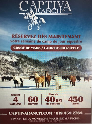 Captiva Ranch a été fondé il y a 30 ans comme un endroit pour échapper aux exigences et aux stress de la vie urbaine. En franchissant les portes de notre ranch de 450 acres dédié aux balades à cheval, situé à 5 minutes à l'est de Wakefield, Québec (La Pêche), les invités pénètrent dans un monde qui ralentit au rythme du cœur d'un cheval.